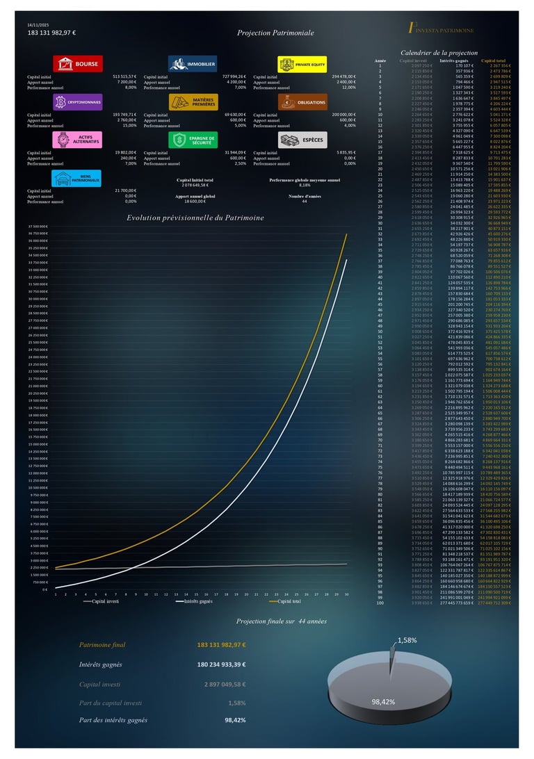 Une projection de votre patrimoine dans le temps, adaptée à votre situation, votre aversion au risque et votre capacité d’épargne mensuelle, permet d’anticiper l’évolution de vos avoirs. Cet outil vous aide à planifier vos objectifs financiers, à préparer sereinement votre avenir personnel et professionnel, et à ajuster votre stratégie patrimoniale en fonction de vos priorités et de votre horizon de placement.